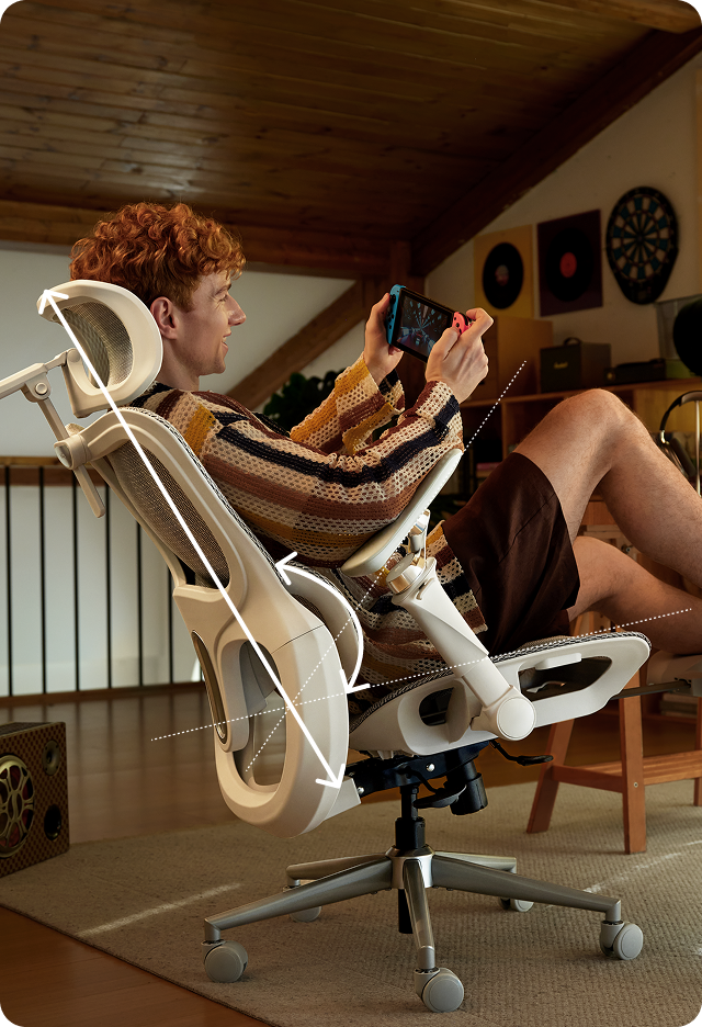 The lumbar support features a multi-dimensional dynamic system, engineered with lateral twist, longitudinal pitch, and vertical bend adjustments. Precision-tailored for varied postures whether leaning forward in focus, hunching over work, reclining at rest, or turning casually, it adapts to your spine’s natural curve, delivering steady, consistent support through every movement.